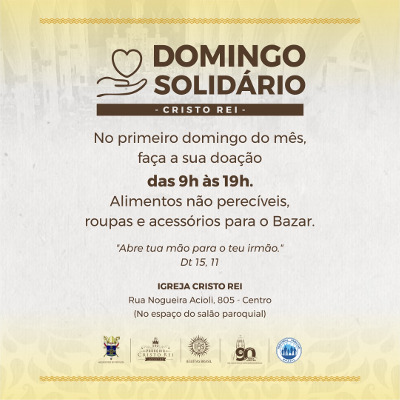 A Paróquia Cristo Rei, realizará mais um DOMINGO SOLIDÁRIO, será dia 04 de OUTUBRO próximo. A Pastoral Familiar e todos os grupos pastoral, estarão de PLANTÃO, para receber sua DOAÇÃO, entre 09 e 19 horas, no salão paroquial. Participe da Celebração Eucarística e faça sua oferta aos mais necessitados. DOE gêneros alimentícios, cestas básicas, acessórios e roupas para o BAZAR SOLIDÁRIO. “Abre tua mão para teu irmão” Dt 15,11